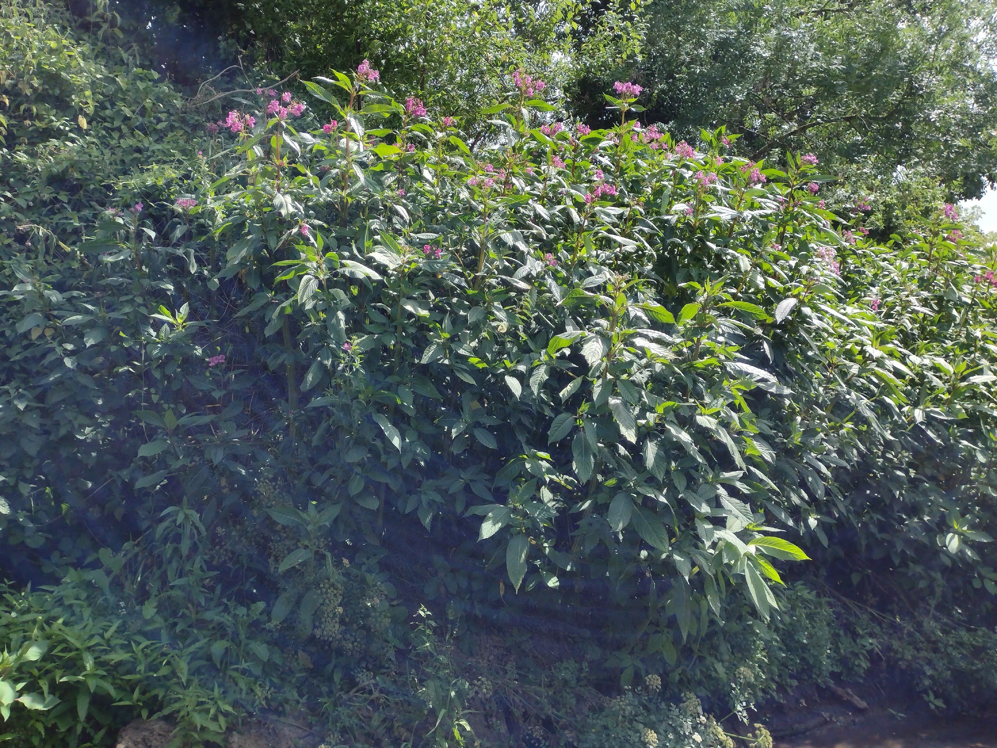 There was a lot of balsam flowering along Meadow Mead and Glebelands and a lot more on the riverbank just downstream from Bridge House. We split into two groups to tackle each area. In Meadow Mead and Glebelands we concentrated on those areas which would be more difficult to reach with a brush cutter which is scheduled to be used in a couple of days. We were able to clear most of the ones which required access via the river bed or scrambling through the undergrowth.